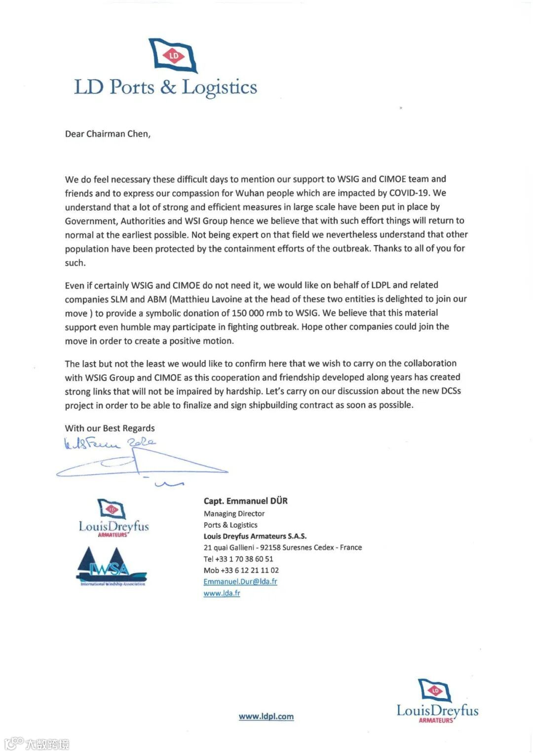 在此,我谨代表LDPL及其相关公司SLM和ABM(这两个公司的总经理马修.拉万先生很高兴能参与我们此次捐赠活动)提供一笔象征性的捐款共计15万人民币给武船集团。虽然这笔捐款可能对武船集团和海工院是微不足道的,但我们相信这份支持可能会对抗击疫情有所帮助。希望其它公司也能够加入到我们的行动中来贡献一份正能量。
