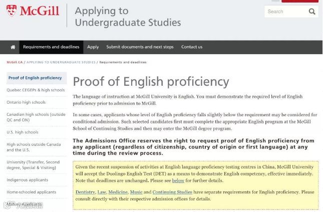 (图为McGill麦吉尔大学允许使用Duolingo考试的声明)