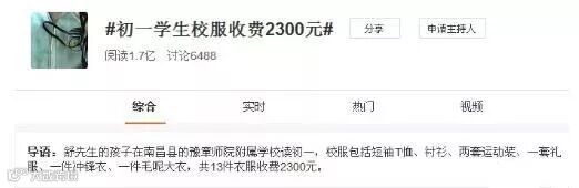 此事经媒体报道后,飞速在网络上发酵。记者注意到,新浪微博已开设#初一学生校服收费2300元#话题,截至11月25日下午17时35分,话题阅读量1.7亿,讨论跟帖数达6422条。
