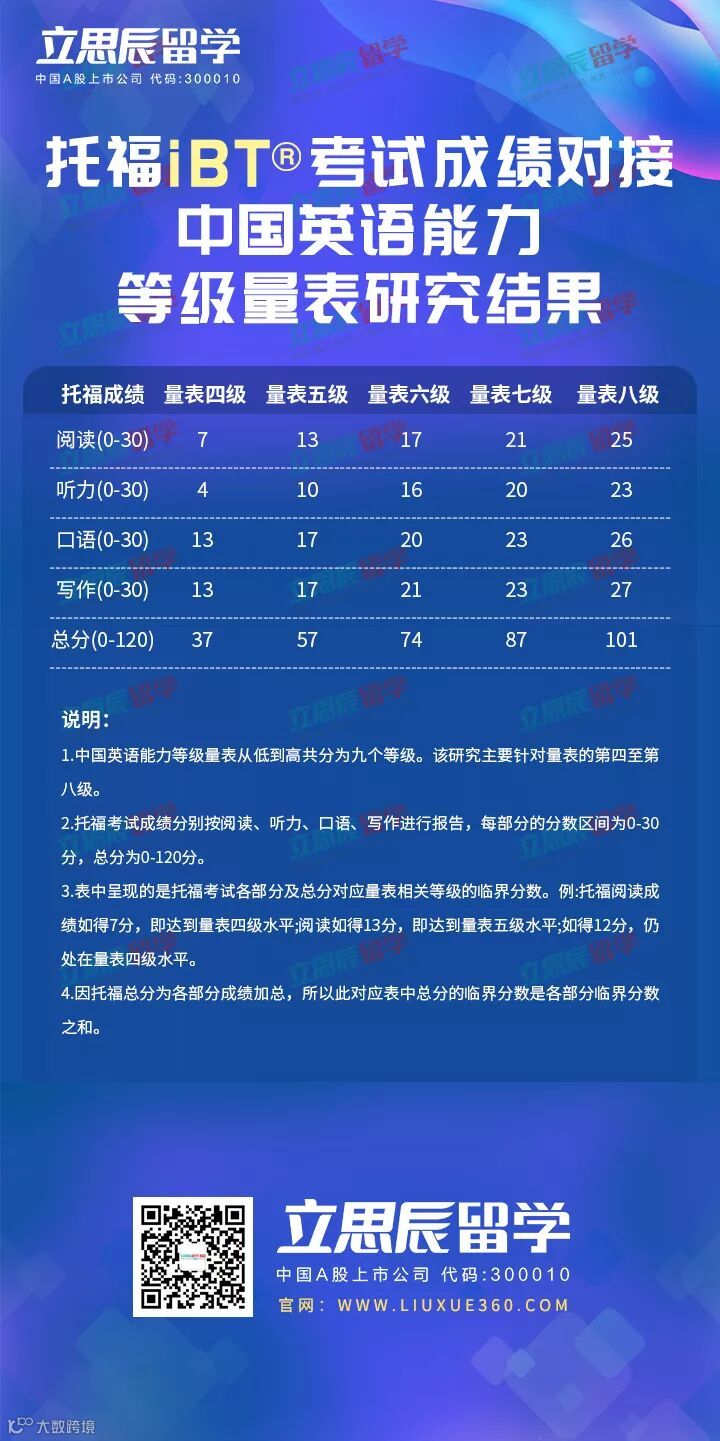 对接结果显示了托福iBT考试阅读、听力、口语、写作等各部分及总分对应量表的相关等级。比如,托福阅读成绩得7分,即达到量表四级水平;阅读13分,即达到量表五级水平。从总分来看,托福考试总成绩101分对应量表八级,87分对应七级,74分对应六级,57分对应五级,37分对应四级。