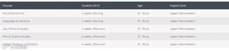 全天课程安排包括全球经济,语言文学,法律道德与社会,电影学,统计学中的批判性思维。