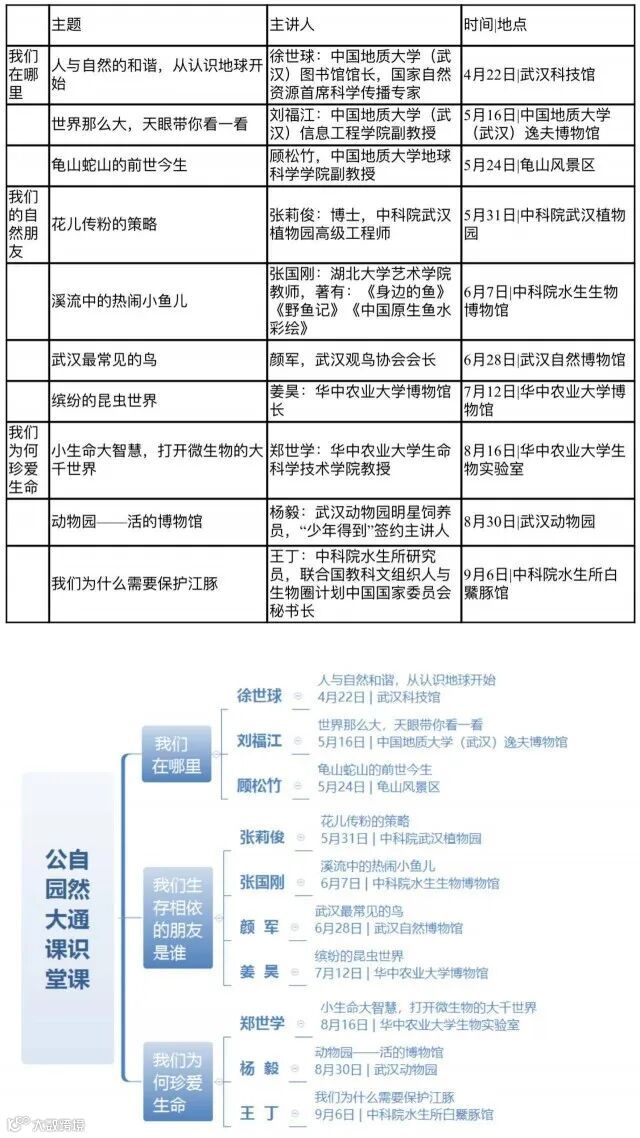 作为具有全国影响力的自然教育活动品牌“公园大课堂”的延伸,自然通识课第1季将特别邀请10位长期从事自然科学研究、擅长科普的大学教授和专家,面向中小学生及武汉市民亲子家庭,结合特定环境,以趣味可感的方式,讲授人人都该知晓的自然科普知识。