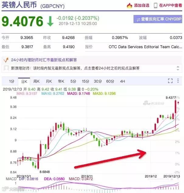 鲍里斯获胜后,英镑疯狂上涨,兑人民币一度冲到9.4,达到2018年5月以来最高水平。并且短期内,这种高位可能得以维持。