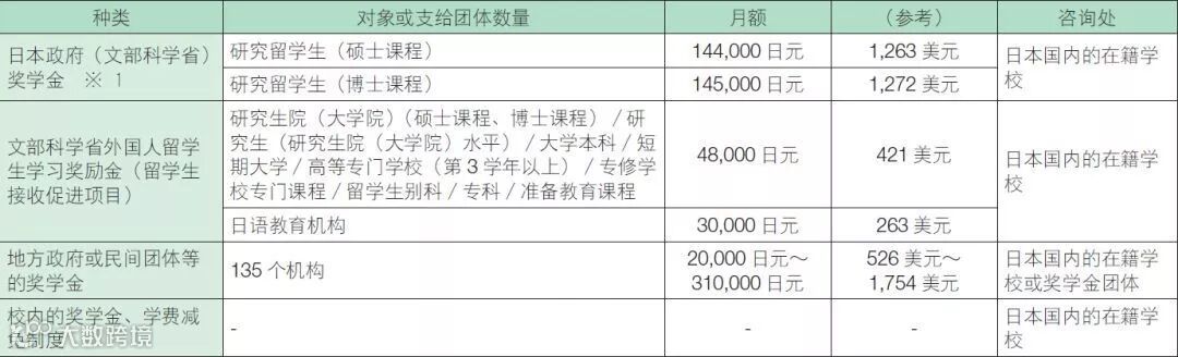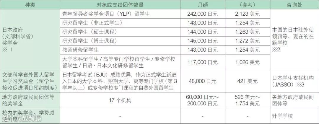 其中,日本政府(文部科学省)奖学金涵盖数量最多,金额也最大,且根据修学、研究地区的不同,存在奖学金叠加情况。