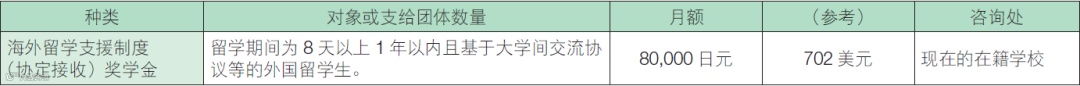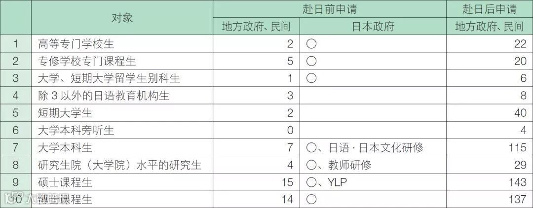 对于专门院校、短期大学、部分日语教育机构生均提供了赴日前后的申请资格,此外主要面向本科和研究生院(大学院)的正规课程的奖学金较多。