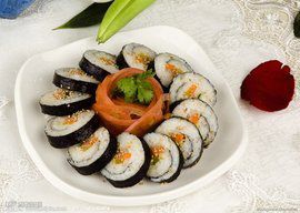 紫菜包饭。是由日本寿司演变而来的一种包饭。它的食材包括米饭、紫菜、鸡蛋、胡萝卜、火腿肠、菠菜、猪肉松。