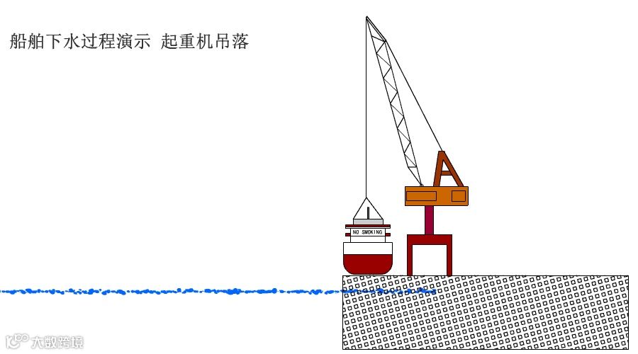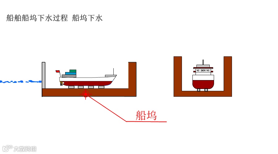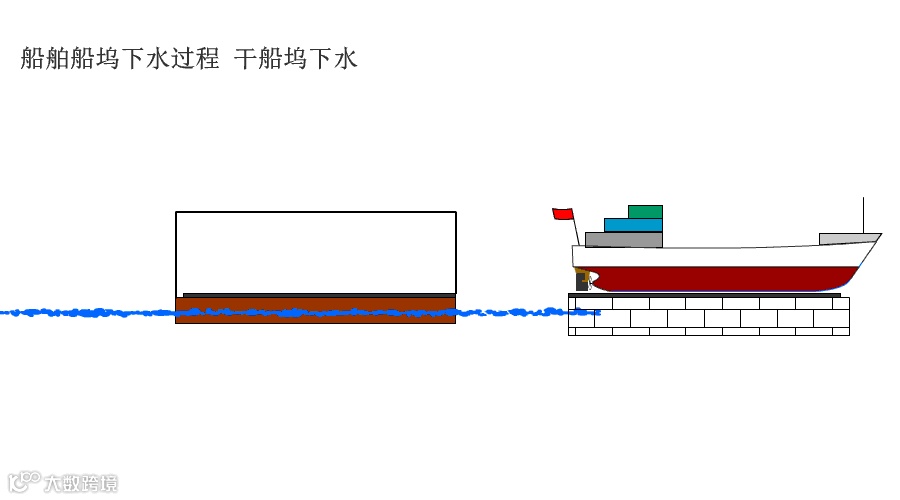 下水过程:干船坞下水是一种将水用水泵或自流方式注入建造船舶的大船坞里,然后依靠船舶自身的浮力将船浮起的下水方式。