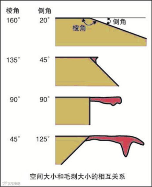 刀具与加工工件空间大小,决定了毛刺的大小,我们来看一下下面这个关系图。