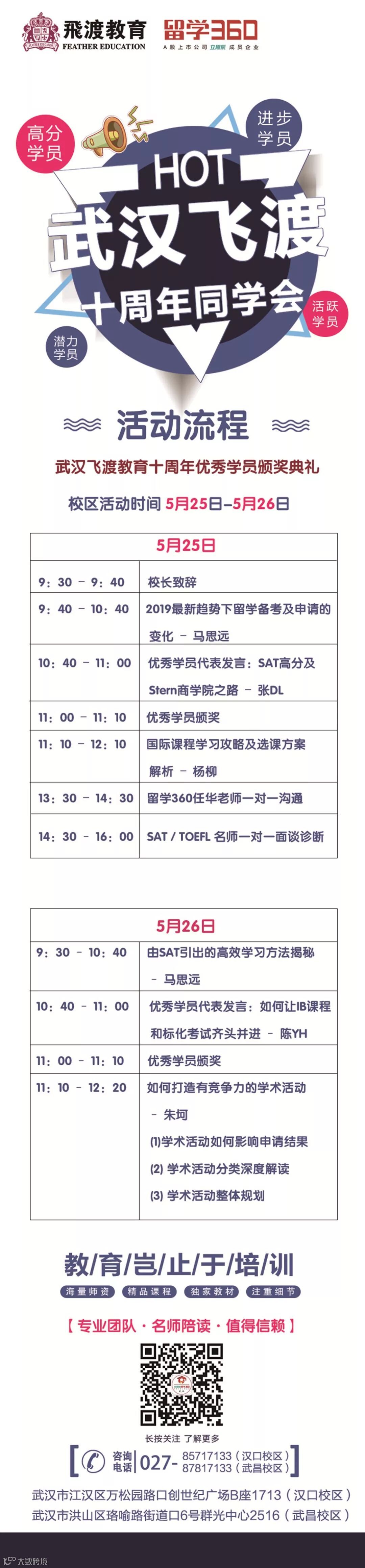 9:30 – 10:40 由SAT引出的高效学习方法揭秘 – 马思远 10:40 – 11:00 优秀学员代表发言:如何让IB课程和标化考试齐头并进 – 陈YH 11:00 – 11:10 优秀学员颁奖 11:10 – 12:20如何打造有竞争力的学术活动 – 朱坷 (1)学术活动如何影响申请结果 (2)学术活动分类深度解读 (3)学术活动整体规划 |