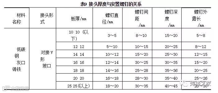 ②灰口铸铁与碳钢装配时,装配间隙要尽量小,通常为0.5~2.0mm。为了提高焊接接头的强度,可在坡口钻孔、攻丝及拧上螺钉,螺钉可装在坡口侧或两侧。接头厚度安置螺钉的关系见表9。