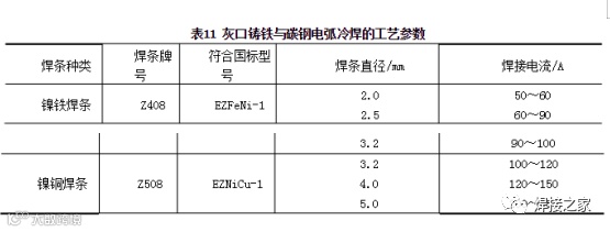 填充材料必须进行150~200℃烘干,保温时间为1~2h。选用镍基焊条电弧冷焊灰口铸铁与碳钢时,焊条直径与焊接电流的关系见表11。