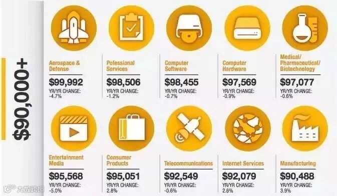上图显示的是2017年美国平均年薪$90,000以上的10个行业(从上左至右下):航空航天、专业服务、计算机软件、计算机硬件、医疗/药学/生物科技、娱乐传媒、消费品、通讯、互联网、制造业。