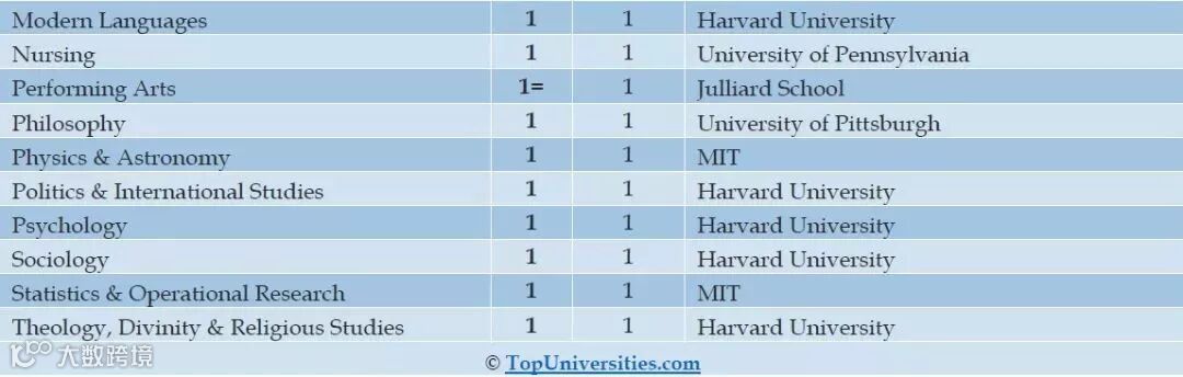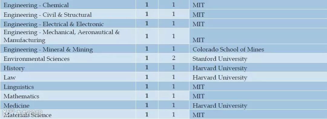 哈佛大学仍然是世界上最优秀的大学,在 12 个不同的学科中排名第一。紧随其后的是麻省理工学院,该研究所在 11 个学科中获得"第一"的排名;