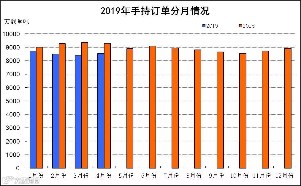 2019年1~4月份,国际航运市场整体处于低位水平,全球新船订单量持续下降。4月当月,波罗的海干散货指数(BDI)回升明显,我国新承接船舶订单量降幅收窄,造船完工量继续增长。重点监测企业工业总产值等主要经济指标同比增长。