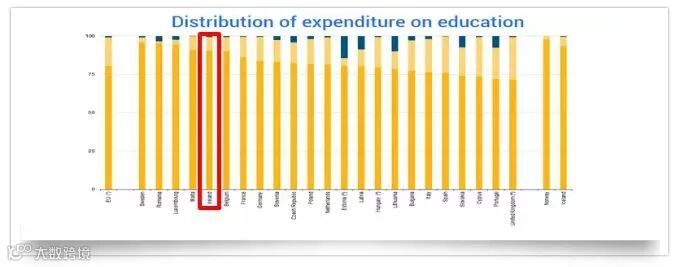 在欧盟统计局(Eurostat)2017年发布的欧盟国家在教育支出板块、政府、非教育机构及国际组织对教育支出的占比中,爱尔兰政府对教育的支出比例高居欧盟第五位。