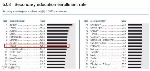如此巨大的政府教育支出,相对应的是极高的教育普及率。根据世界经济峰会2016年调查数据显示,爱尔兰中学教育毛入学率高达126.5%(此数大于100%表明每年有很多非爱尔兰常住居民选择在爱尔兰接受教育),排名全球第八位。