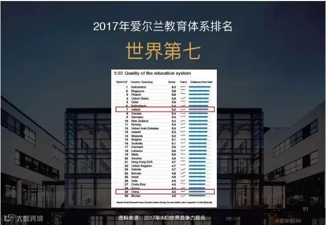 在2017的世界竞争力排名中,爱尔兰教育质量世界排名第7,超过了德国、法国、澳大利亚、新西兰,就连美国前总统奥巴马都说“爱尔兰人是世界上受到为数不多的良好教育的人群”。