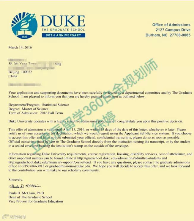 学生的数学成绩很好,但由于申请研究生的决定做得比较晚,因此时间非常紧张,欠缺院校所偏好的软性背景,也不了解名校的录取要求。在带她了解美国统计学相关开设院校以及专业的课程和就业情况等精准信息后,相互默契配合,结合具体需求精准定位,最终顺利拿到了杜克大学统计学的录取。
