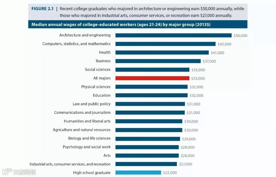 同时,21到24岁毕业生(基本上就是应届毕业生)的工资中位数中,建筑及工程方向的薪资最高($50k),紧接着是计算机,统计及数学($43k)。