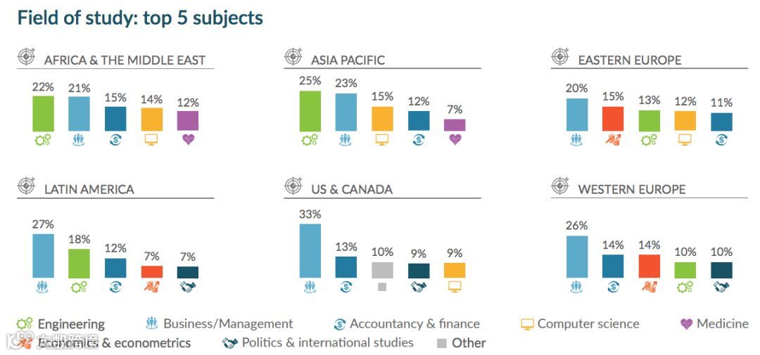 据QS本次调查显示,全球雇主招聘最多的五大专业包括:工程、会计与金融、商业与管理研究、计算机科学与信息系统、经济与计量经济学。