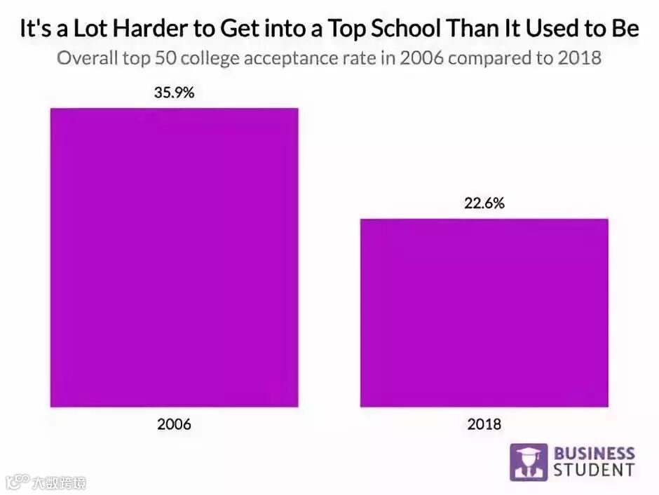 所以现在美国的顶尖大学录取难度已经2倍于12年前的录取难度。