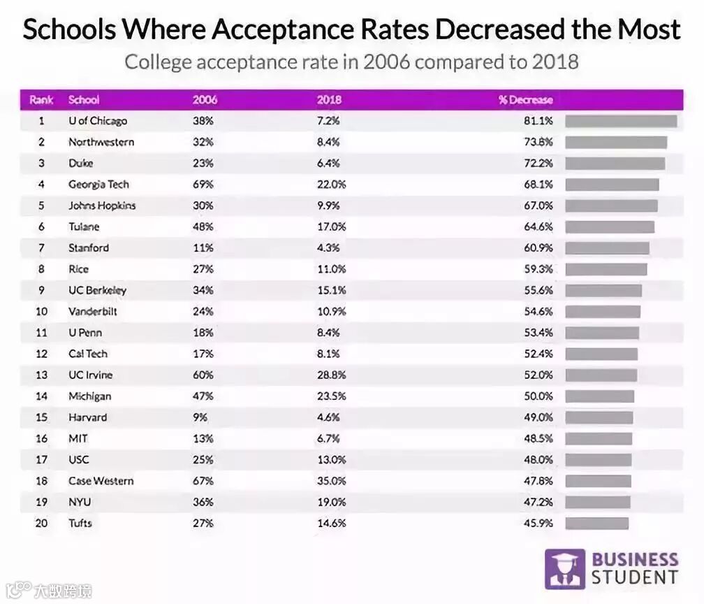 在所有学校中,芝加哥大学的录取率下降最为明显。