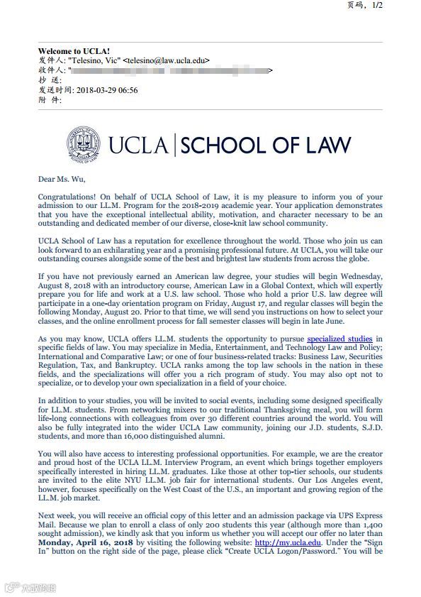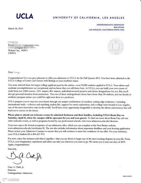 UCLA是众多学生的梦想,因其顶尖的学术水平而被誉为美国商业金融,高科技产业,电影艺术等人才的摇篮,竞争非常激烈。在众多的申请者中,LYT 同学是准备的非常早的,在其高二的暑假,我就建议他多参加社区和志愿的活动。学生的TOEFL一直考不出来,在开始申请的时候,也只有75分。最后,跟学校发邮件多次沟通,学生最后用SAT成绩递交加州大学。在文书构思中,学生提供的信息少的可怜,总觉得自己没什么闪光点,毫无优势可言。后来,他说曾经在在武汉协和医院爱心病房做过志愿者,并为白血病儿童拍摄过游乐园短片。经过多次与学生沟通,我帮学生找到自己的优势所在—有爱心、领导力、创新能力和学习新知识的能力。最终高质量的完成了本科申请的文书。录取到UCLA的物理专业。