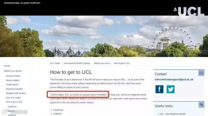 UCL大学木有官方接机服务UCL is unable to operate airport transfers(图片来自UCL大学官网)