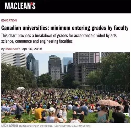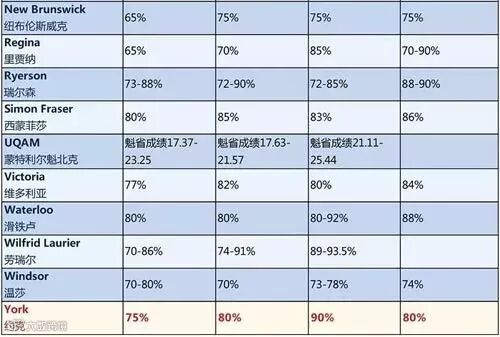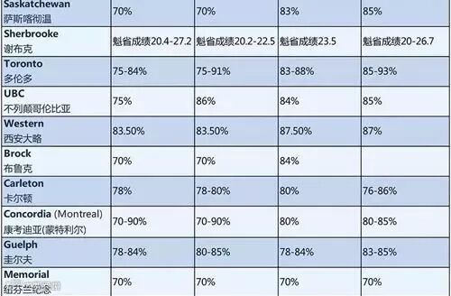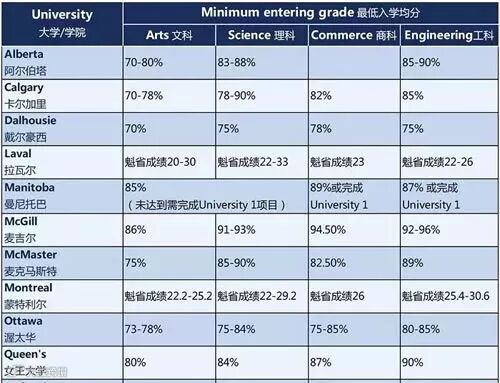 加拿大著名的麦克林杂志Maclean's,根据加拿大主要大学/学院不同类型专业(文/理/商/工科)针对加拿大本国大一新生的最低入学均分,我们可以从中参考一些院校的录取平均水平: