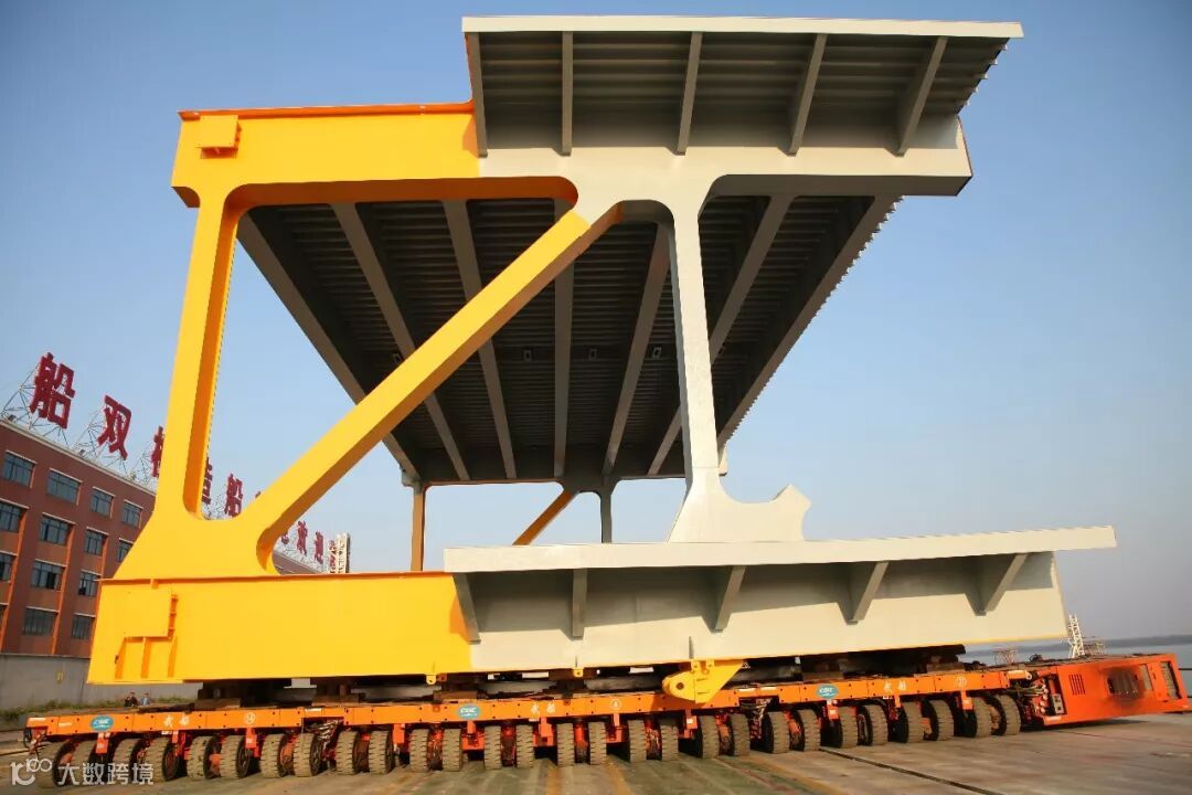 上午10时,首节钢桁梁经过完整报检,驻场监理确认后,由56轴线并联的模块车缓缓顶起,转运到斜船架指定位置。