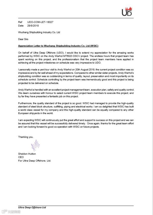 近日,特发来表扬信以表达对武船的认可及感谢。