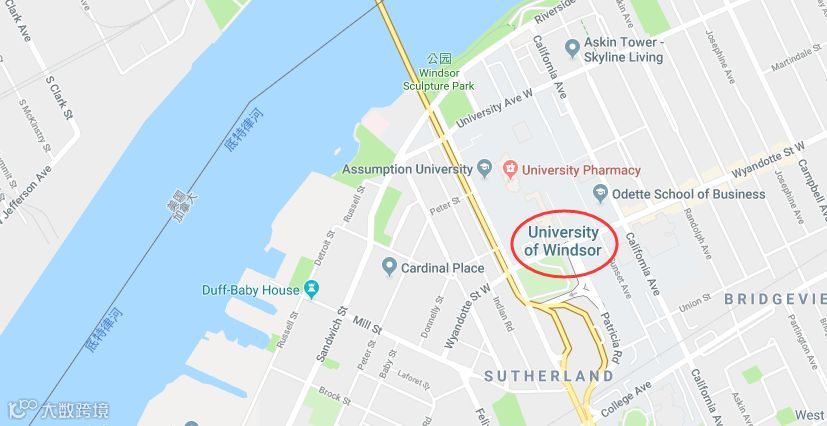 温莎大学沿河而建,对面就是美国著名城市底特律,开车几分钟就到了。有了这种地理优势,温莎也被称为“加拿大的汽车工业首都”。