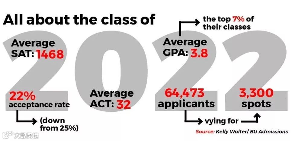 波士顿大学class of 2022今年有64473名申请者,也是BU史上申请人数最多的一次,录取率只有22%,其中文理学院和工程学院竞争最为激烈。被录学生SAT均分在1468,ACT为32,GPA为3.8。
