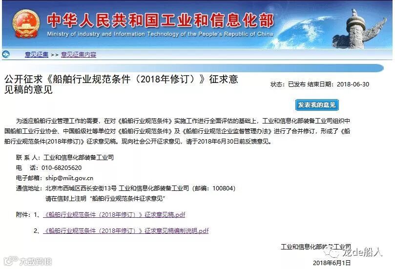 6月1日,工信部网站发布公告,为适应船舶行业管理工作的需要,在对《船舶行业规范条件》实施工作进行全面评估的基础上,工业和信息化部装备工业司组织中国船舶工业行业协会、中国船级社等单位对《船舶行业规范条件》及《船舶行业规范企业监督管理办法》进行了合并修订,形成了《船舶行业规范条件(2018年修订)》征求意见稿。现向社会公开征求意见。