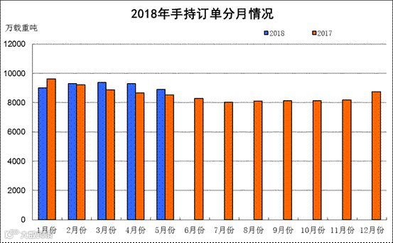 2018年1~5月份,我国新接船舶订单量和手持订单量继续增长,造船完工量降幅收窄,重点监测企业工业总产值等主要经济指标同比下降。