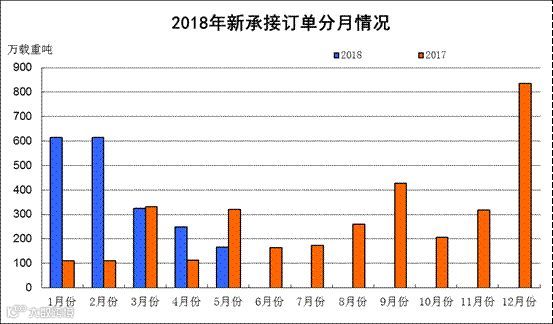 1~5月份,全国造船完工1643万载重吨,同比下降28.3%。承接新船订单1968万载重吨,同比增长99.6%。5月底,手持船舶订单8903万载重吨,同比增长7.5%,比2017年底增长2.1%。