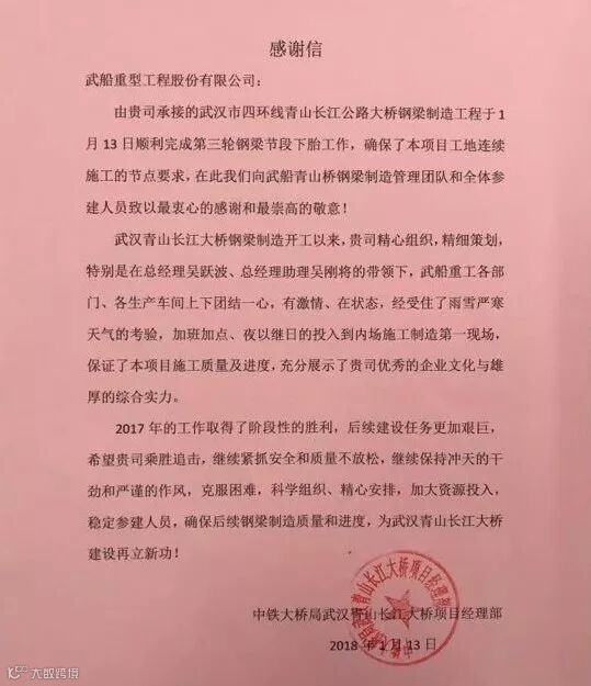 中铁大桥局武汉青山长江大桥项目经理部感谢信