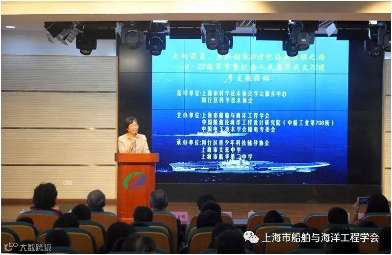 “走向深蓝,巨轮铺就21世纪海上丝绸之路--4•23海军节暨纪念人民海军成立70周年主题活动”于2019年4月23日在闵行区航华第二中学和文来中学举行。活动由上海市船舶与海洋工程学会、中国船舶与海洋工程设计研究院、中国电工技术学会船电专委会联合举办。上海市船舶与海洋工程学会副理事长、科普和学生工作委员会主任韩华,闵行区科协副主席雷志术,闵行区青少年科技辅导协会会长叶银花,闵行区航华第二中学校长张凤荣及两所学校的师生共600余人出席了本次活动。