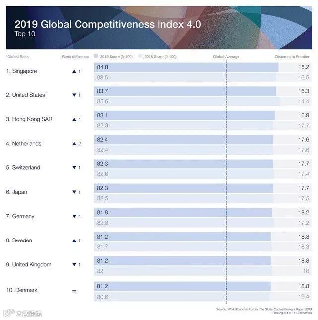 新加坡在满分为100分的这一指数体系中总分为84.8,位列榜首。美国排名第二,得分83.7。其他进入前十名的G20经济体有日本(第6位)、德国(第7位)和英国(第9位),阿根廷(83位)则成为排名最低的G20成员。