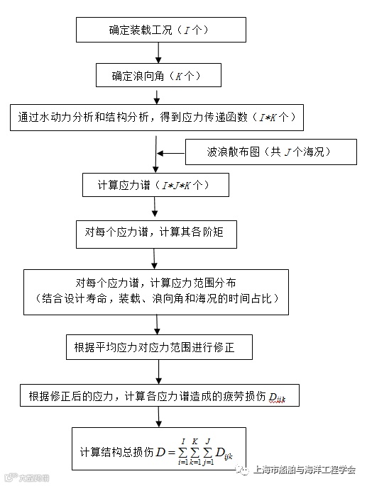 疲劳谱分析方法是疲劳强度评估的基本方法。采用疲劳谱分析进行疲劳强度评估时,首先根据实船的外壳形状及质量分布进行水动力计算得到波浪载荷,通过全船有限元分析得到应力的传递函数,然后结合环境条件(波浪散布图)计算应力的响应谱,最后通过进行谱分析得到应力范围的分布并结合S-N曲线计算结构的疲劳损伤。