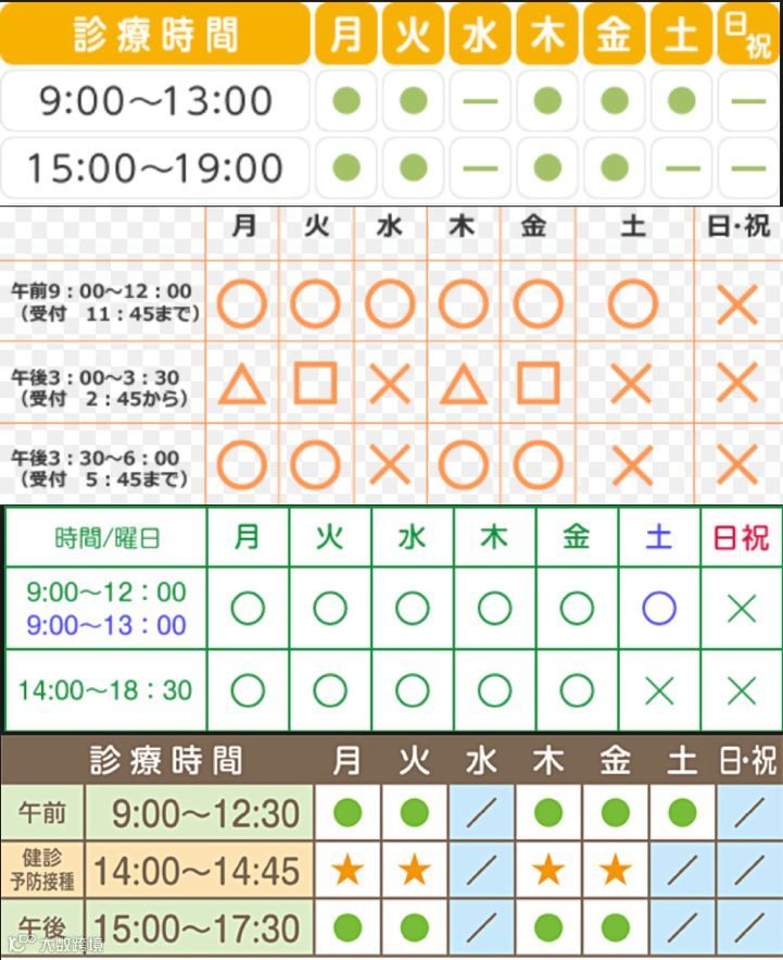 可是,社区诊所并不是24小时上班制,与此相反,有些诊所的上班时间还非常短……如图所示,除了工作日某天的定休,大部分的诊所在周末和祝日(周日)是不开门的。