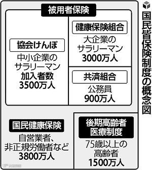 国民皆保险制度大致分为“被用者保险”,“国民健康保险”以及“后期高龄者医疗制度”(如图所示)。作为留学生,我加入的便是国民健康保险。每个月定期交付2千日元左右的保险金,拿着国民保险证去诊所看病,我只需要负担十分之三的医疗费用。