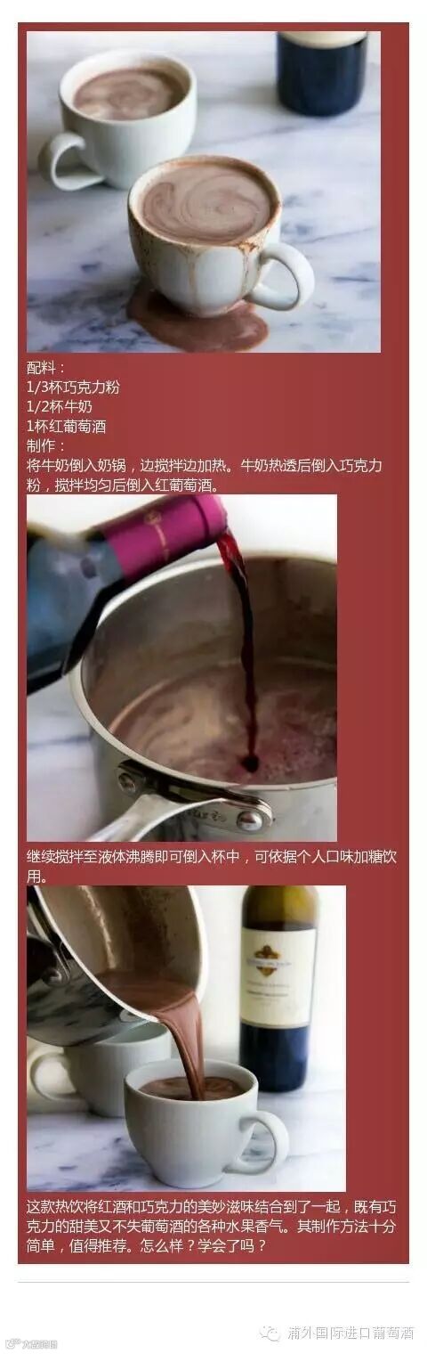 导读:寒冷的冬天,来一杯红酒巧克力热饮,既不失巧克力的醇香又饱含着红酒的水果香气,满满的冬季福利......