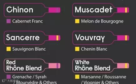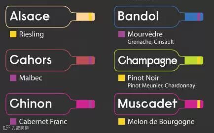 下图列出了法国主要产区酿制葡萄酒的葡萄品种,以便帮助消费者了解本产区最有可能使用的葡萄品种。