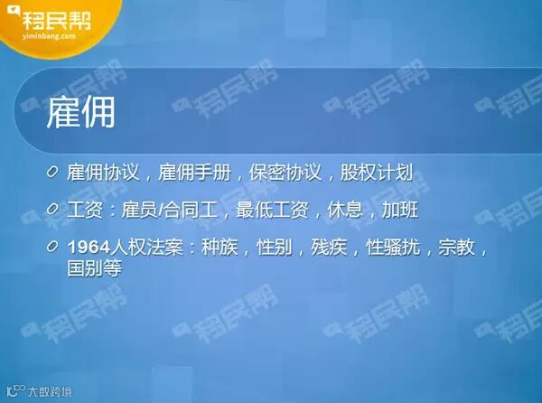 雇佣时要有雇佣合同,以及最低工作一定要达到,另外工作时长也要有,加班要付加班费等等。同时在公司里要注意,美国对种族、性别、残疾、宗教、国籍有任何的歧视,都可以提起诉讼。所以,在美国经营公司,一定要跟律师、会计师紧密配合,才能成功的经营下去。