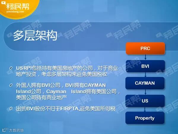 从税的方面来讲,尤其是做房地产投资时会有税的返还,这时会用到海外公司,比如说BVI,或者开曼群岛、艾尔岛等,这是从税的方面去考虑,当然这都是一些比较复杂的多层架构,也需要和会计师及律师的密切配合。
