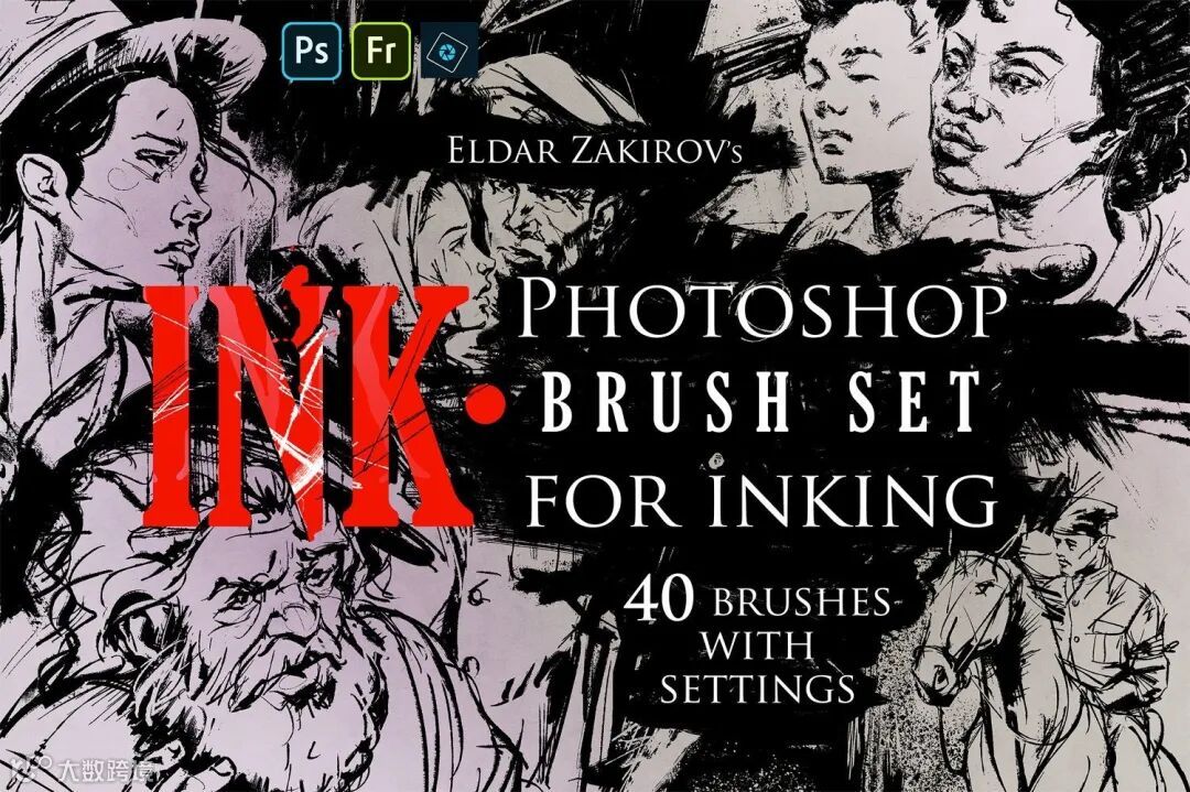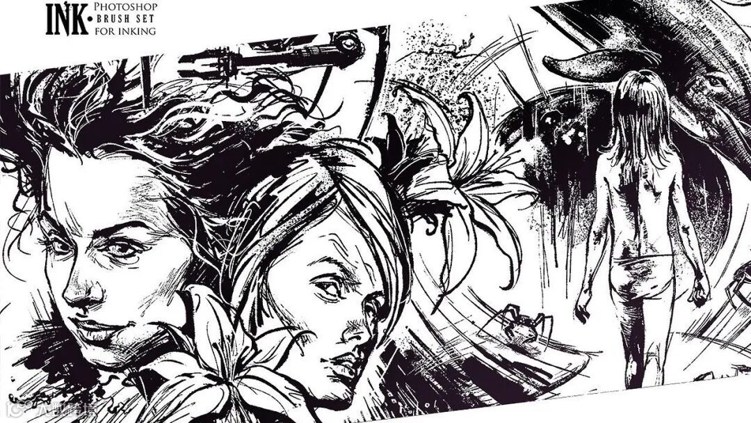 INK• 40 Photoshop Brushes with all settings for inking (37 brushes imitating real pens, brushes, sprays, and splashes + 3 splashes/blot brushes from the “SPLASHES” brush set) for realistic digital Inking in Photoshop.