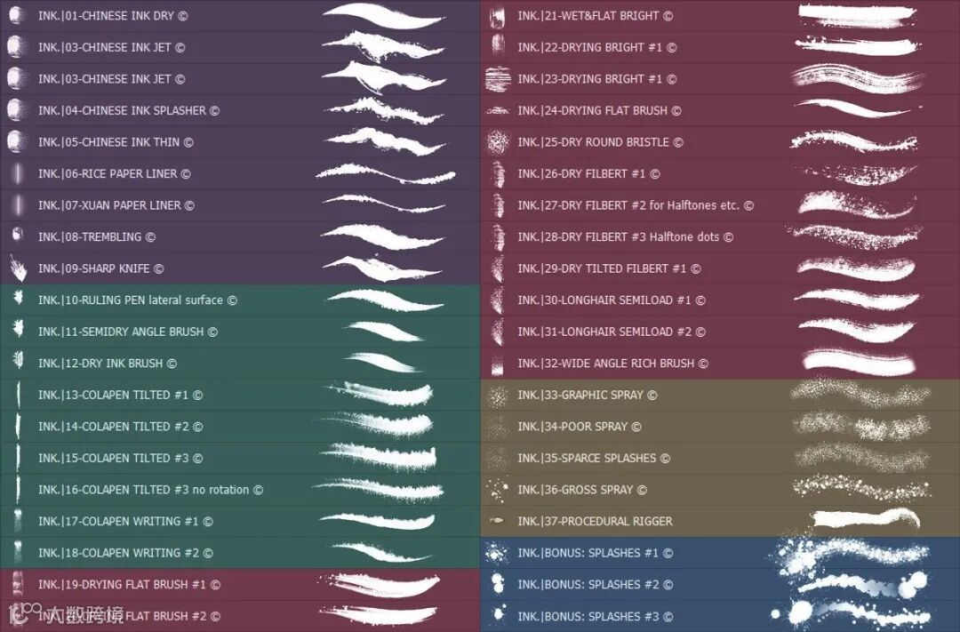 这些刷子模仿了真实的工具,如尖头笔和平笔,毛笔,圆笔和扁平笔,墨水,直角笔和折叠笔,其中一些会像真正的工具一样产生一些漂亮的飞溅。许多喷雾和飞溅画笔将为您的艺术赋予活力和细腻的自然感。