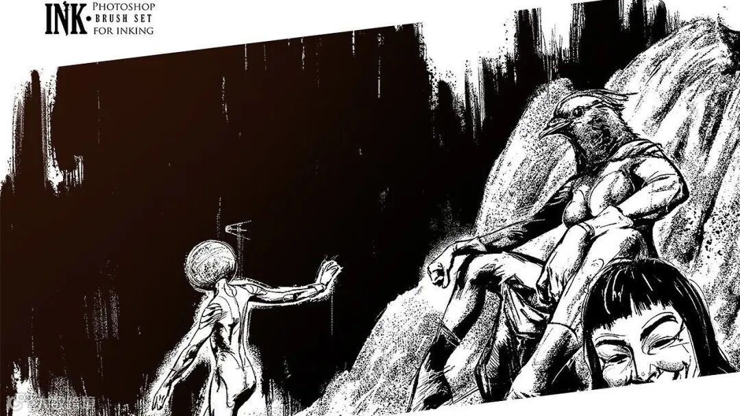 INK. 40 Photoshop Brushes for Inking + Photoshop Action for 100% black.