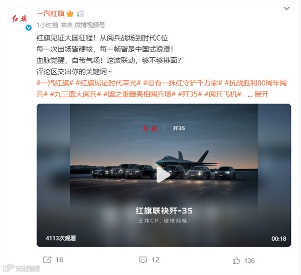 据第一财经报道,从一汽红旗处获悉,本次大阅兵的检阅车为红旗CA7601J,该车在2019年也被作为检阅车。而2009年和2015年的检阅车为CA7600J。